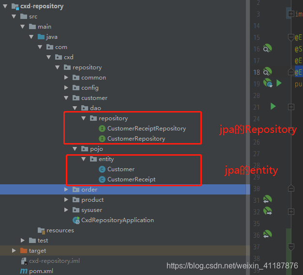 而每建一个子项目都有依赖相应的实体(Entity,对应数据库中的某个表)、数据仓库(Repository)。